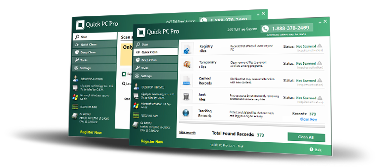 Quick PC Pro Cleaning Tool Advanced Registry Detection Technology detects and removes or repairs registry files as well as fixes wrong system configurations.